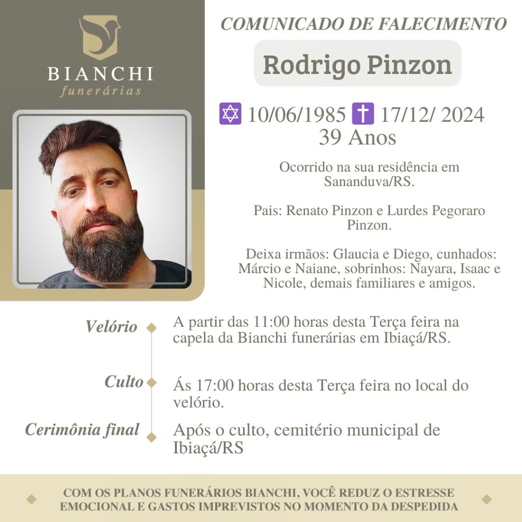 A Bianchi Funerárias, juntamente com a família Pinzon, comunica com pesar, o falecimento de Rodrigo Pinzon, ocorrido dia 17/12/2024 em sua residência em Sananduva com 39 anos de idade. Seu corpo será guardado a partir das 11 horas do dia 17/12/2024 na Capela da Bianchi Funerárias de Ibiaçá. Culto às 17 horas e após seu sepultamento no Cemitério Municipal de Ibiaçá.
