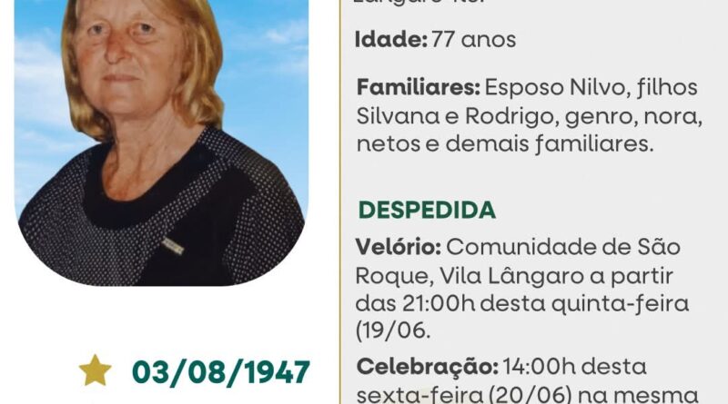 A Funerária São Cristóvão, juntamente com a família Conte, comunica com pesar, o falecimento de Rosa Maria Benetti Conte, ocorrido às 16h30 do dia 19/06/2025 em sua residência em São Roque – Vila Lângaro com 77 anos de idade. Seu corpo está sendo velado no Salão de São Roque – Vila Lângaro. Celebração às 14 horas do dia 20/06/2025 no e após seu sepultamento no Cemitério da mesma Cominidade.