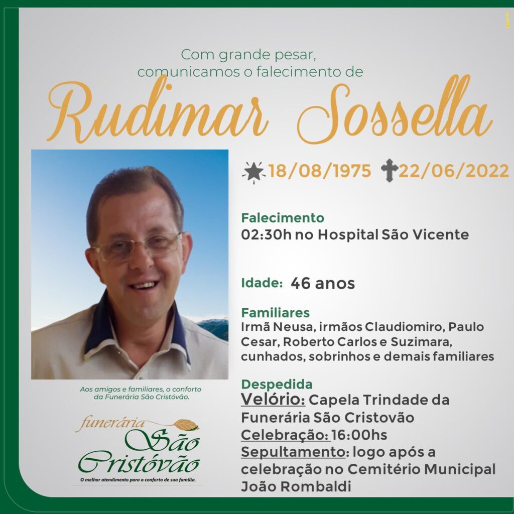 A Funerária São Cristóvão, juntamente com a família Sossella, comunica com pesar, o falecimento de Rudimar Sossella, ocorrido às 02:30 horas do dia 22/06 no Hospital São Vicente de Paulo de Passo Fundo com 46 anos de idade. Seu corpo está sendo velado na Capela Trindade da Funerária São Cristóvão. Celebração às 16:00 horas e após seu sepultamento. No Cemitério Municipal João Rombaldi.