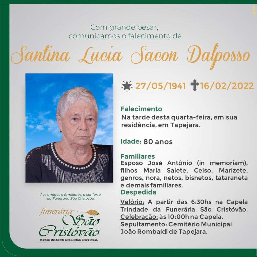 A Funerária São Cristóvão, juntamente com as famílias Sacon e Dalposso, comunicam com pesar, o falecimento da senhora Santina Lucia Sacon Dalposso, ocorrido na tarde de quarta- feira (16/02), em sua residência com 80 anos de idade. Velório na Capela Trindade da Funerária São Cristóvão. Celebração às 10:00 horas de quinta-feira (17/02) na Capela e após seu sepultamento no Cemitério Municipal João Rombaldi.