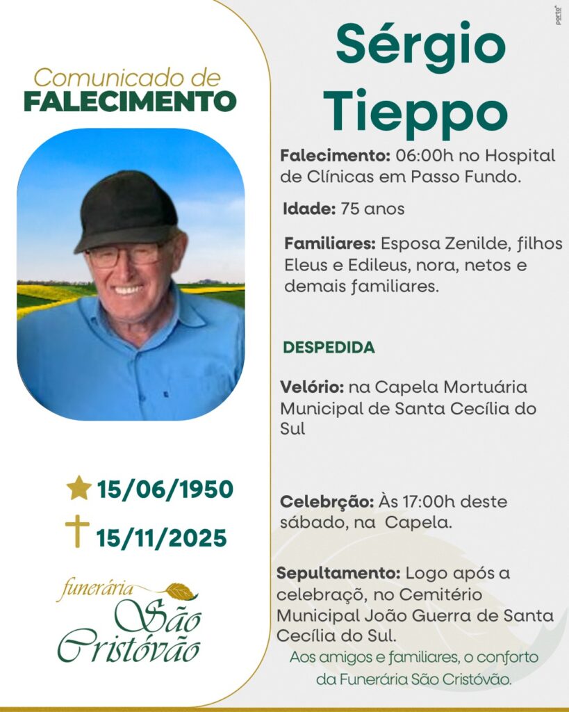 A Funerária São Cristóvão, juntamente com a família Tieppo, comunica com pesar, o falecimento de Sérgio Tieppo, ocorrido às 06 horas do dia 15/11/2025 no Hospital de Clínicas de Passo Fundo com 75 anos de idade. Seu corpo está sendo velado na Capela Municipal de Santa Cecília do Sul. Celebração às 17 horas do dia 15/11/2025 e após seu sepultamento no Cemitério Municipal João Guerra de Santa Cecília do Sul.