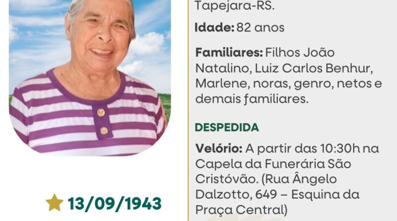 A Funerária São Cristóvão, juntamente com a família Nogueira, comunica com pesar, o falecimento de Setembrina Terres Gomes Nogueira, ocorrido às 05 horas do dia 25/12/2025 no HSA de Tapejara com 82 anos de idade. Seu corpo está sendo guardado na Capela da Funerária São Cristóvão. Culto às 16 horas do dia 25/12/2025 e após seu sepultamento no Cemitério Municipal João Rombaldi.