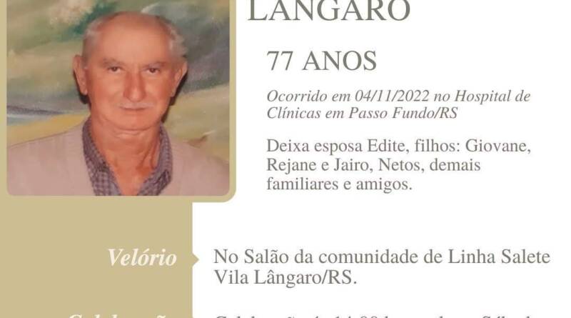A Bianchi Funerárias, juntamente com a família Lângaro, comunica com pesar, o falecimento de Silvestre Tadeu Lângaro, ocorrido dia 04/11/2022 no Hospital de Clínicas de Passo Fundo com 77 anos de idade. Seu corpo está sendo velado no Salão da Comunidade de Linha Saldte – Vila Lângaro. Celebração às 14:00 horas do dia 05/11/2022 e após seu sepultamento no Cemitério da mesma comunidade