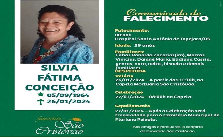 A Funerária São Cristóvão, juntamente com a família Conceição, comunica com pesar, o falecimento de Sílvia Fátima Conceição, ocorrido às 08 horas do dia 26/01/2024 no HSA de Tapejara com 56 anos de idade. Seu corpo será velado a partir das 11h30 na Capela Mortuária São Cristóvão. Celebração às 08 horas do dia 27/01/2024 na Capela e após seu sepultamento no Cemitério Municipal de Floriano Peixoto.