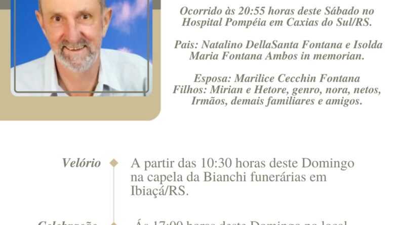 A Bianchi Funerárias, juntamente com a família Fontana, comunica com pesar, o falecimento de Sinval Fontana, ocorrido às 20h55 do dia 27/12/2025 no Hospital Pompéia de Caxias do Sul com 63 anos de idade. Seu corpo será velado a partir das 10h30 do dia 28/12/2025 na Capela da Bianchi Funerárias de Ibiaçá. Celebração às 17 horas no local do velório e após seu sepultamento no Cemitério Municipal de Ibiaçá.