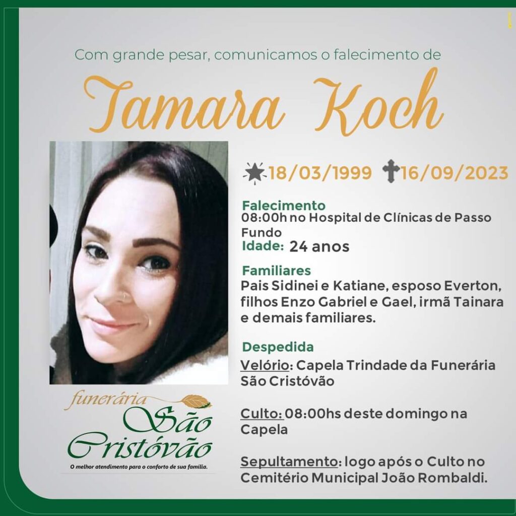 A Funerária São Cristóvão, juntamente com a família Koch, comunica com pesar, o falecimento de Tamara Koch ocorrido às 08 horas do dia 16/09/2023 no Hospital de Clínicas de Passo Fundo com 24 anos de idade. Seu corpo está sendo guardado na Capela Trindade da Funerária São Cristóvão. Celebração às 08 horas do dia 17/09/2023 e após seu sepultamento no Cemitério Municipal João Rombaldi.