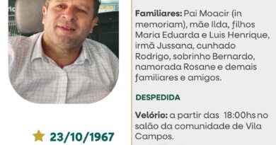 A Funerária São Cristóvão, juntamente com a família Rebelato, comunica com pesar, o falecimento de Teresa Biazzoto Rebelato, ocorrido às 02 horas do dia 11/07/2023 no HSA com 98 anos de idade. Seu corpo está sendo velado no Salão da Comunidade de Nossa Senhora de Lourdes – Charrua. Celebração na tarde desra terça-feira com horário a ser definido e após seu sepultamento no Cemitério da mesma comunidade.