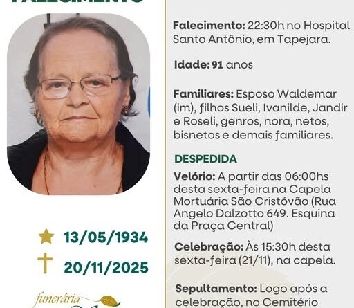 A Funerária São Cristóvão, juntamente com a família Dalbosco, comunica com pesar, o falecimento de Tereza Posser Dalbosco, ocorrido às 22h30 do dia 20/11/2025 no HSA de Tapejara com 91 anos de idade. Seu corpo está sendo velado na Capela da Funerária São Cristóvão. Celebração às 15h30 do dia 21/11/2025 e após seu sepultamento no Cemitério Municipal João Rombaldi.