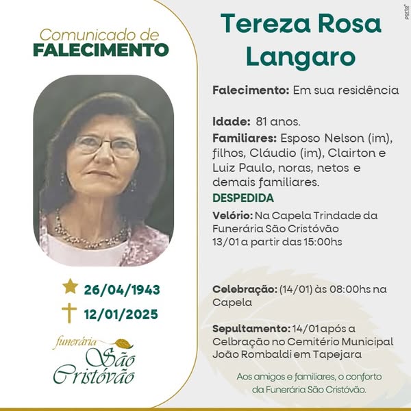 A Funerária São Cristóvão, juntamente com a família Lângaro, comunica com pesar, o falecimento de Tereza Rosa Lângaro, ocorrido dia 12/01/2025 em sua residência com 81 anos de idade. Seu corpo será velado na Capela Trindade da Funerária São Cristóvão a partir das 15 horas do dia 13/01/2025. Celebração às 08 horas do dia 14/01/2025 e após seu sepultamento no Cemitério Municipal João Rombaldi.