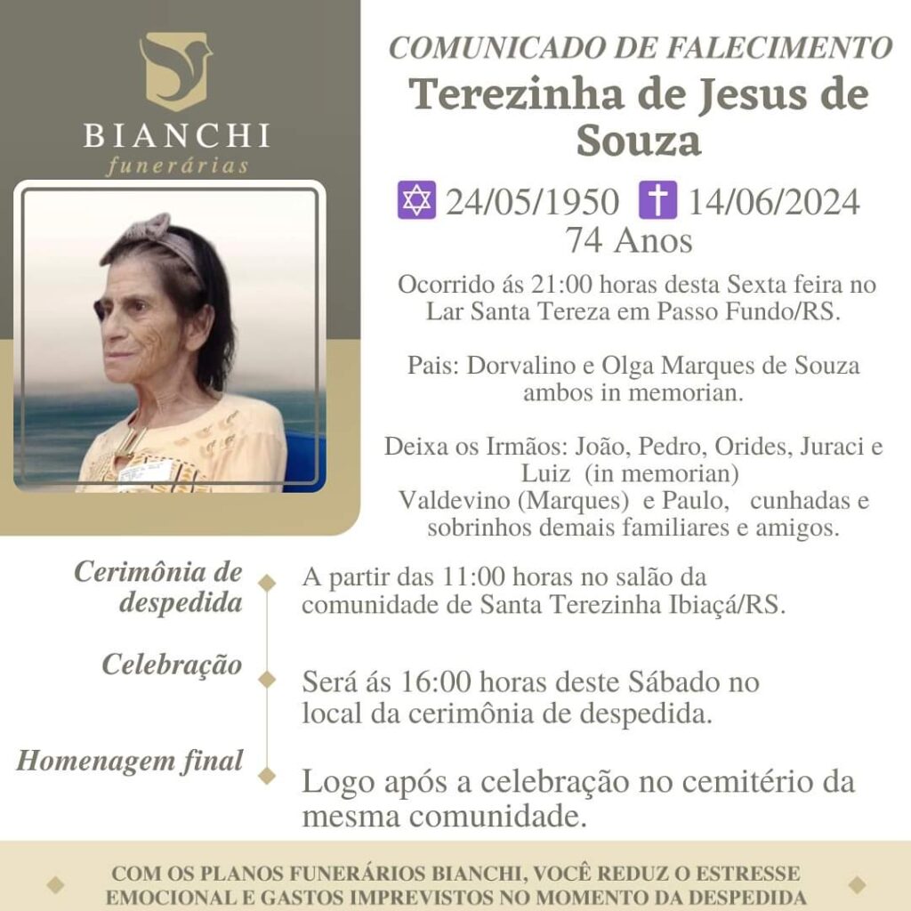 A Bianchi Funerárias, juntamente com a família Souza, comunica com pesar, o falecimento de Terezinha de Jesus de Souca, ocorrido às 21 horas do dia 14/06/2024 no no Lar Santa Tereza de Passo Fundo com 74 anos de idade. Seu corpo está sendo velado no Salão da Cominidade de Santa Terezinha – Ibiaçá. Celebração às 16 horas do dia 15/06/2024 e após seu sepultamento no Cemitério da mesma localidade