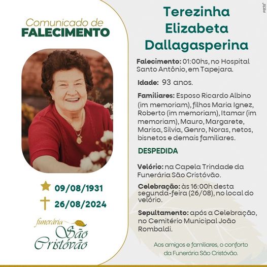 A Funerária São Cristóvão, juntamente com a família Dalagasperina, comunica com pesar, o falecimento de Terezinha Elizabeta Dalagasperina, ocorrido à 01 hora do dia 26/08/2024 no HSA de Tapejara. Seu corpo está sendo velado na Capela Trindade da Funerária São Cristóvão. Celebração às 16 horas do dia 26/08/2024 e após seu sepultamento no Cemitério Munivcipal João Rombaldi.
