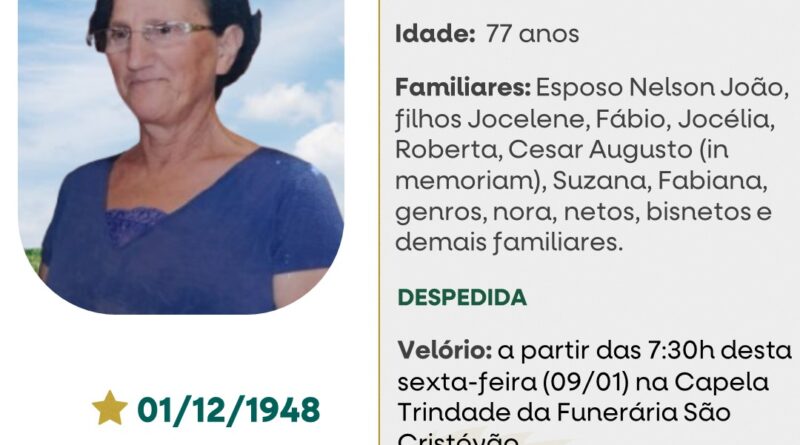 A Funerária São Cristóvão, juntamente com a família Fontana, comunica com pesar, o falecimento de Terezinha Fontana Piroli , ocorrido às 04h30 do dia 09/01/2026 em Tapejara com 77 anos de idade. Seu corpo será guardado a partir das 07h30 horas na Capela Trindade da Funerária São Cristóvão. Culto às 16 horas do dia 09/01/2026 no local e após seu sepultamento no Cemitério Municipal João Rombaldi de Tapejara.