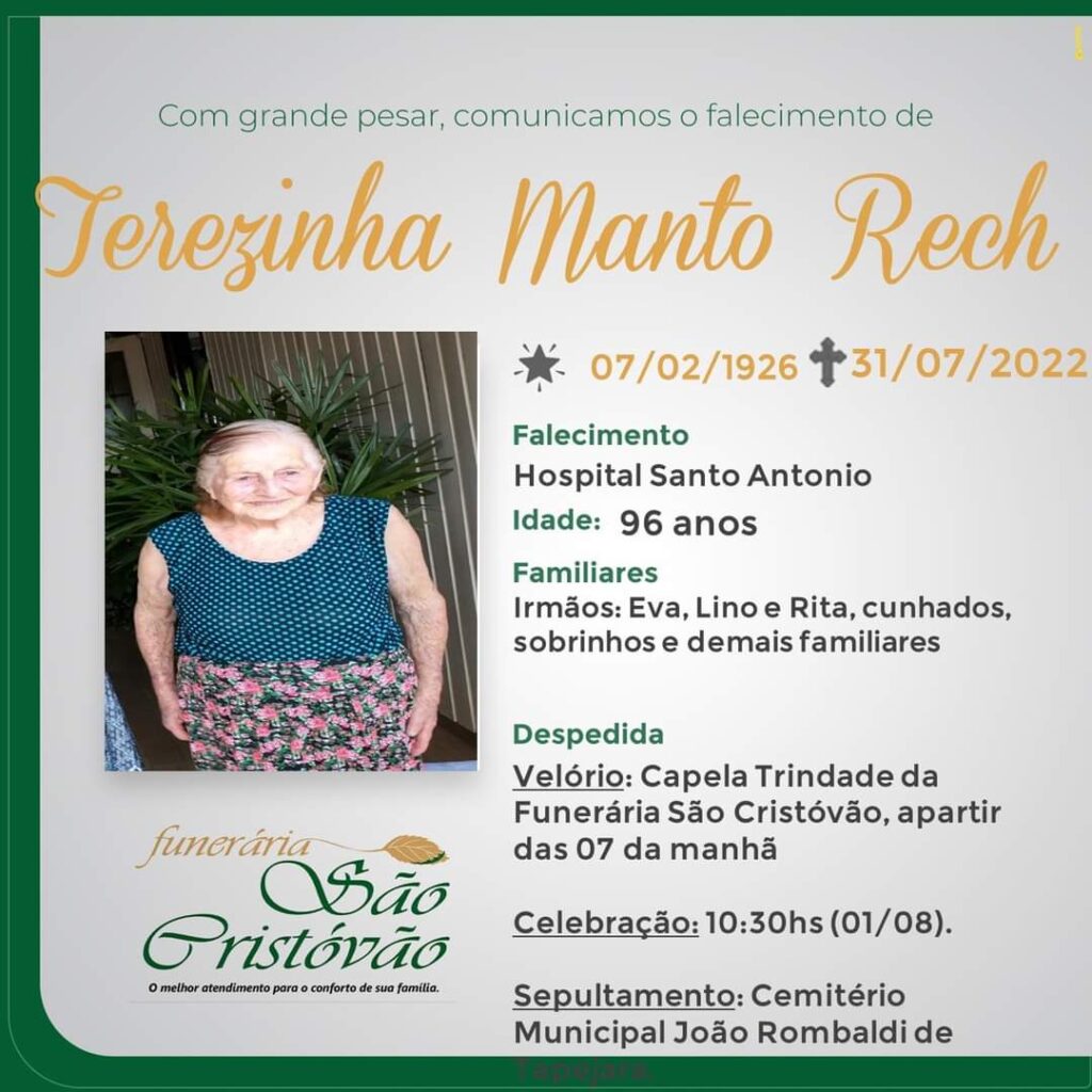 A Funerária São Cristóvão, juntamente com a família Rech, comunica com pesar, o falecimento da senhora Terezinha Manto Rech, oorrido às dia 31/07 no HSA com 96 anos de idade. Seu corpo será velado a partir das 07:00 horas do dia 01/08, na Capela Trindade da Funerária São Cristóvão. Celebração às 10:30 horas e após seu sepultamento. No Cemitério Municipal João Rombaldi.