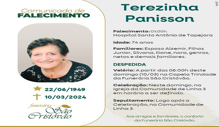 A Funerária São Cristóvão, juntamente com a família Panisson, comunica com pesar, o falecimento de Terezinha Panisson, ocorrido à 01 hora do dia 10/03/2024 no HSA de Tapejara com 74 anos de idade. Seu corpo está sendo velado na Capela Trindade da Funerária São Cristóvão. Celebração às 14h30 do dia 10, na Igreja da Capela da Comunidade de Linha 3. Sepultamento no Cemitério da mesma comunidade após a celebração.