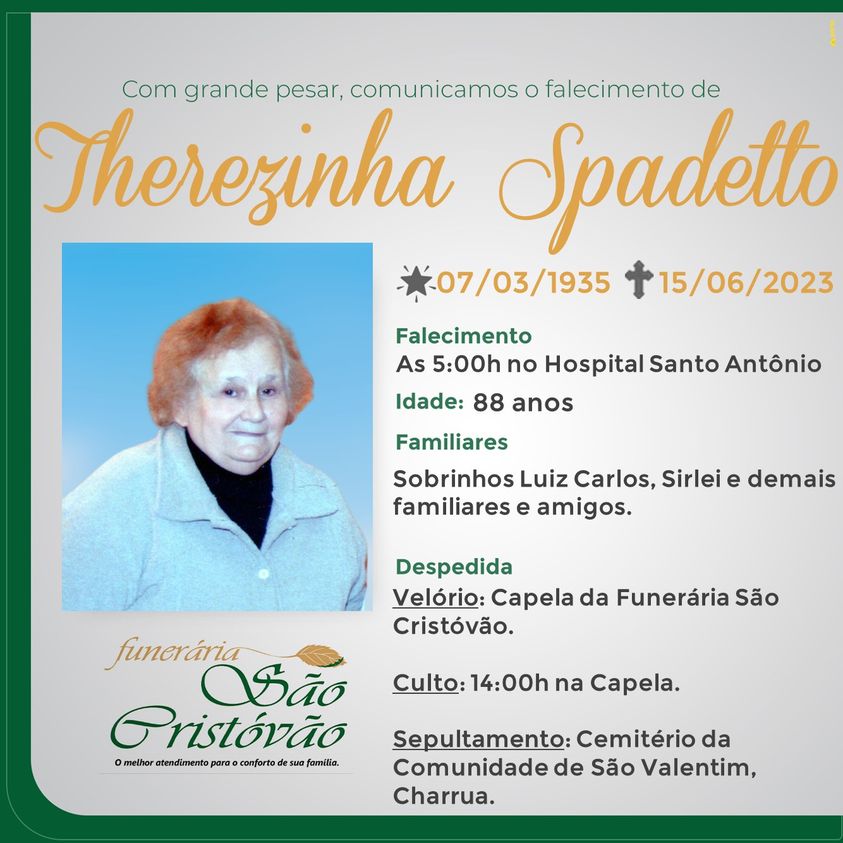 A Funerária São Cristóvão, juntamente com a família Spadetto, comunica com pesar, o falecimento de Therezinha Spadetto, ocorrido às 05 horas do dia 15/06/223 no HSA com 88 anos de idade. Seu corpo está sendo guardado na Capela da Funerária São Cristóvão. Culto às 14 horas e após seu sepultamento no Cemitério da Comunidade de São Valentim – Charrua.