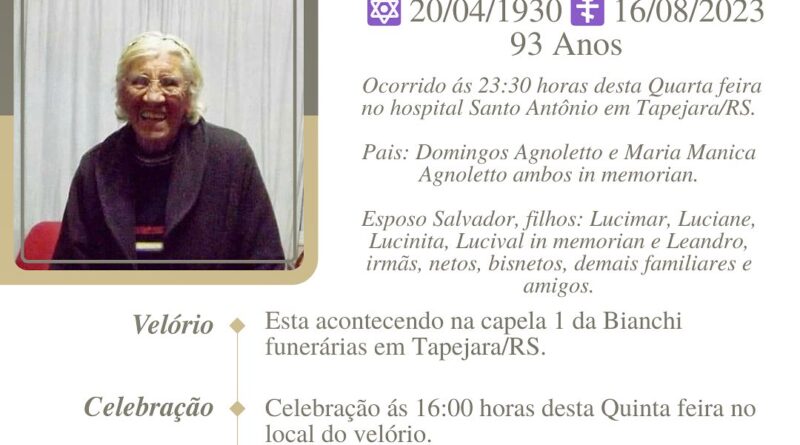 A Bianchi Funerárias, juntamente com a família dos Santos, comunica com pesar, o falecimento de Therezinha Judita dos Santos, ocorrido às 23h 30 do dia 16/08/2023 no HSA com 93 anos de idade. Seu corpo está sendo velado na Capela I da Bianchi Funerárias. Celebração às 16 horas do dia 17/08/2023 e após seu sepultamento no Cemitério Municipal João Rombaldi.