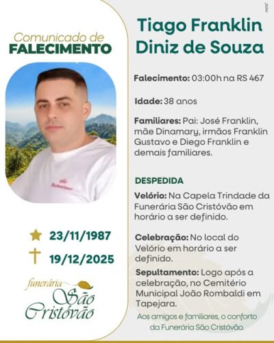 A Funerária São Cristóvão, juntamente com a família de Souza, comunica com pesar, o falecimento de Tiago Franklin Diniz de Souza, ocorrido às 04 horas do dia 19/12/2025 ne ERS-467 em Tapejara com 38 anos de idade. Seu corpo está sendo velado na Capela Trindade da Funerária São Cristóvão. Celebração no local do velório com horário a ser definido e após seu sepultamento no Cemitério Municipal João Rombaldi.