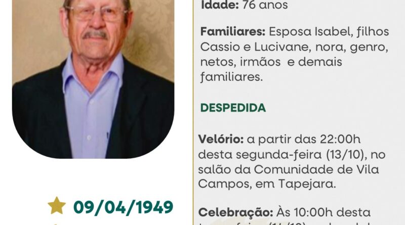 A Funerária São Cristóvão, juntamente com a família Sossella, comunica com pesar, o falecimento de Vaime Sossella, ocorrido às 18 horas do dia 13/10/2025 no HSA de Tapejara com 76 anos de idade. Seu corpo está sendo velado no Salão da Comunidade de Vila Campos – Tapejara. Celebração às 10 horas do dia 14/10/2025 e após seu sepultamento no Cemitério da mesma localidade.