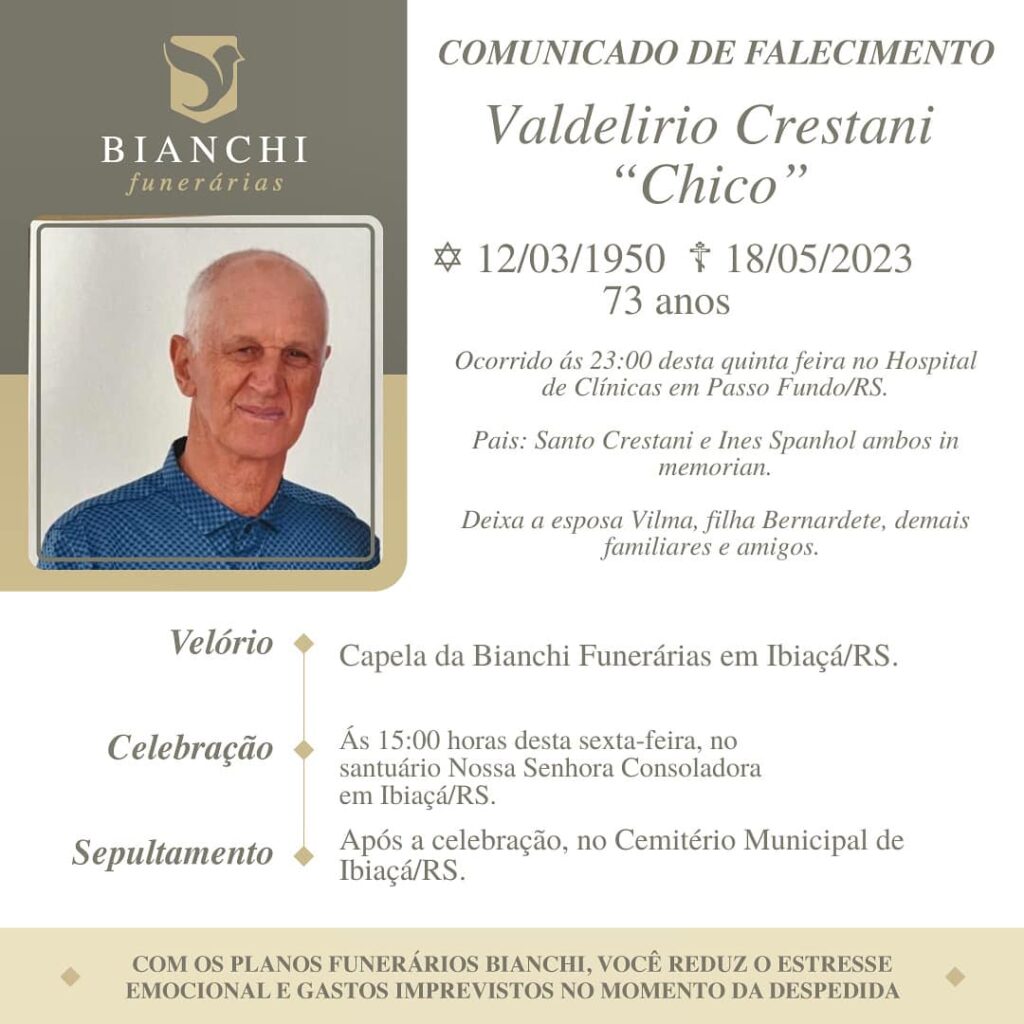 A Bianchi Funerárias, juntamente com a família Crestani, comunica com pesar, o falecimento de Valderirio Crestani – “Chico”, ocorrido às 23 horas do dia 18/05/2023 no Hospital de Clínicas de Passo Fundo com 73 anos de idade. Seu corpo está sendo velado na Capela da Bianchi Funerárias de Ibiaçá. Celebração às 15 horas do dia 19/05/2023 no Santuário Nossa Senhora Consoladora de Ibiaçá e após seu sepultamento no Cemitério Municipal de Ibiaçá.