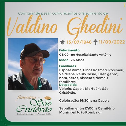 A Funerária São Cristóvão, juntamente com a família Ghedini, comunica com pesar, o falecimento do senhor Valdino Ghedini, ocorrido às 08:00 horas do dia 11/09 no HSA com 76 anos de idade. Seu corpo está sendo velado na Capela da Funerária São Cristóvão. Celebração às 16:30 horas e após seu sepultamento. No Cemitério Municipal João Rombaldi.
