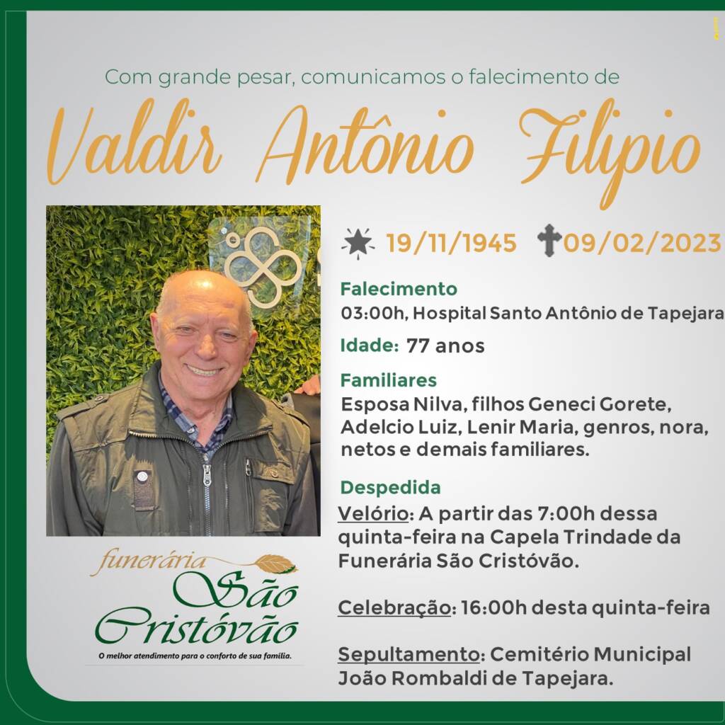 A Funerária São Cristóvão, juntamente com a família Filipio, comunica com pesar, o falecimento de Valdir Antônio Filipio, ocorrido às 03:00 horas do dia 09/02/2023 no HSA com 77 anos de idade. Seu corpo está sendo velado na Capela Trindade da Funerária São Cristóvão. Celebração às 16:00 horas do dia 10/02/2023 e após seu sepultamento no Cemitério Municipal João Rombaldi.