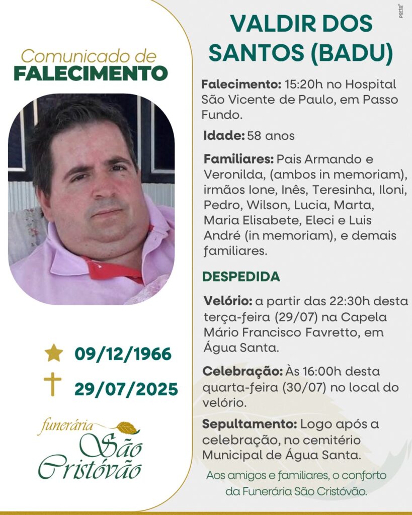 A Funerária São Cristóvão, juntamente com a família dos Santos, comunica com pesar, o falecimento de Valdir dos Santos – “Badu”, ocorrido às 15h20 do dia 29/07/2025 no Hospital São Vicente de Paulo de Passo Fundo com 58 anos de idade. Seu corpo está sendo velado na Capela Mortuária Municipal de Água Santa. Celebração às 16 horas do dia 30/07/2025 e após seu sepultamento no Cemitério Municipal de Água Santa.