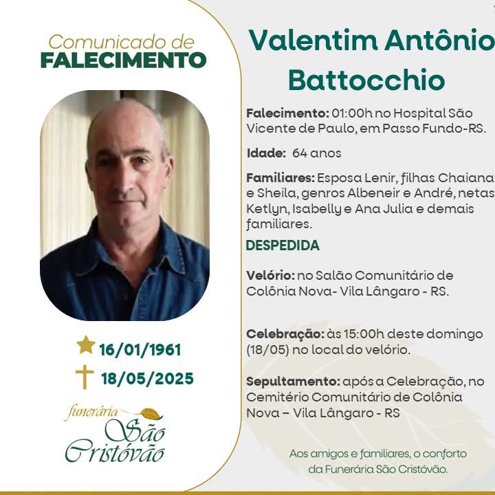 A Funerária São Cristóvão, juntamente com a família Battocchio, comunica com pesar, o falecimento de Valentim Antônio Battocchio, ocorrido à 01 hora do dia 18/05/2025 no Hospital São Vicente de Paulo de Passo Fundo com 64 anos de idade. Seu corpo está sendo velado no Salão da Comunidade de Colonia Nova – Vila Lângaro. Celebração às 15 horas do dia 19/05/2025 e após seu sepultamento no Cemitério da mesma Comunidade.