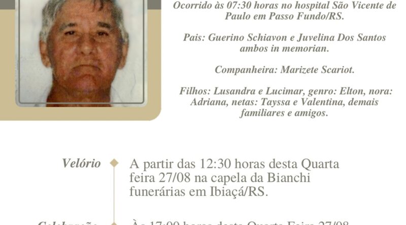 A Bianchi Funerárias, juntamente com a família Schiavon, comunica com pesar, o falecimento de Veroni Luiz Schiavon, ocorrido às 07h30 do dia 27/08/2025 no Hospital São Vicente de Paulo de Passo Fundo com 75 anos de idade. Seu corpo está sendo velado na Capela da Bianchi Funerárias de Ibiaçá. Celebração às 17 horas do dia 27/08/2025 e após seu sepultamento no Cemitério Municipal de Ibiaçá.