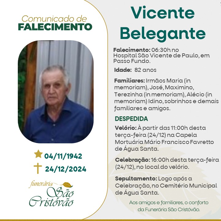 A Funerária São Cristóvão, juntamente com a família Belegante, comunica com pesar, o falecimento de Vicente Belegante, ocorrido às 06h30 no Hospital São Vicente de Paulo de Passo Fundo com 82 anos de idade. Seu corpo será velado a partir das 11 horas do dia 24/12/2024 na Capela Mortuária Municipal de Água Santa. Celebração às 16 horas deste dia 24 e após seu sepultamento no Cemitério Municipal de Água Santa.