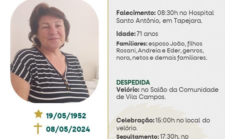 A Funerária São Cristóvão, juntamente com a família Marcon, comunica com pesar, o falecimento de Vilma Marcon, ocorrido às 08h30 do dia 08/05/2024 no HSA de Tapejara com 71 anos de idade. Seu corpo está sendo velado no salão da Comunidade de Vila Campos – Tapejara. Celebração às 15 horas do dia 08/05/2024 no local do velório e seu sepultamento acontecerá às 17h30 no Cemitério da Comunidade de Vila Campos – Tapejara