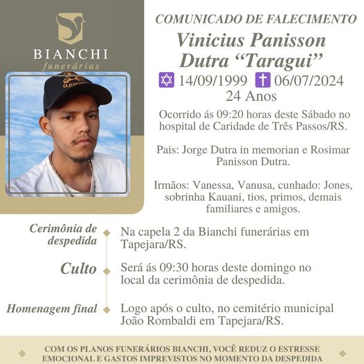 A Bianchi Funerárias, juntamente com a família Dutra, comunica com pesar, o falecimento de Vinícius Panisson Dutra – “Taragui”, ocorrido às 09h20 do dia 06/07/2024 no Hospital de Caridade de Três Passos. Seu corpo está sendo guardado na Capela 2 da Bianchi Funerárias de Tapejara. Culto, às 09h30 do dia 07/07/2024 e após seu sepultamento no Cemitério Municipal João Rombaldi.