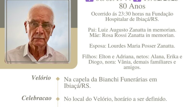 A Bianchi Funerárias, juntamente com a família Zanatta, comunica com pesar, o falecimento de Vitalino Zanatta, ocorrido às 23h30 do dia 19/02/2025 na Fundação Hospitalar de Ibiaçá com 80 anos de idade. Seu corpo está sendo velado na Capela da Bianchi Funerárias de Ibiaçá. Celebração com horário a ser definido. Após a celebração seu corpo será sepultado no Cemitério Municipal de Ibiaçá.