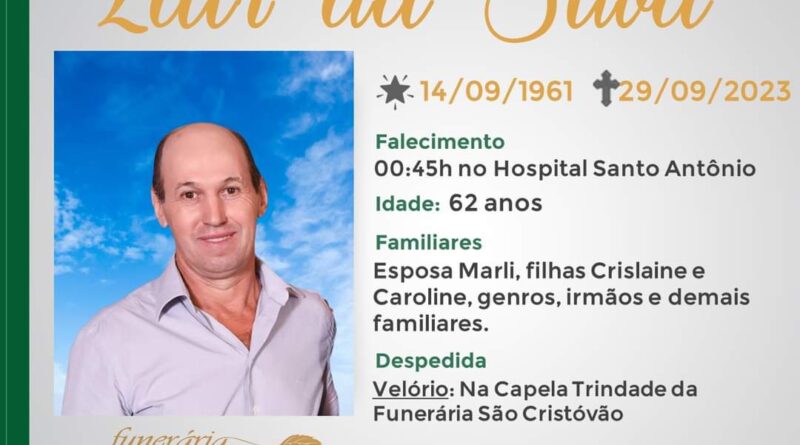A Funerária São Cristóvão, juntamente com a família da Silva, comunica com pesar, o falecimento de Zair da Silva, ocorrido às 00h 45 do dia 29/09/2023 no HSA com 62 anos de idade. Seu corpo está sendo velado na Capela Trindade da Funerária São Cristóvão. Celebração às 15horas de hoje e após seu sepultamento no Cemitério Municipal João Rombaldi.