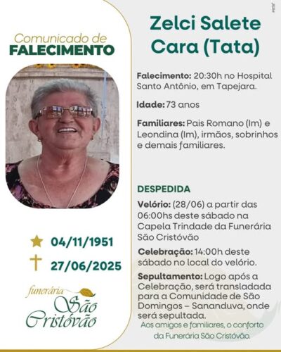 A Funerária São Cristóvão, juntamente com a família Cara, comunica com pesar, o falecimento de Zelsi Salete Cara – “Tata”, ocorrido às 20h30 do dia 27/06/2025 no HSA de Tapejara com 73 anos de idade. Seu corpo está sendo velado na Capela Trindade da Funerária São Cristóvão. Celebração às 14 horas do dia 28/07/2025 no local do velório e após seu corpo será transladado para a Comunidade de São Domingos – Sananduva onde será sepultada.