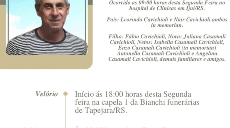 A Bianchi Funerárias juntamente com a família Cavichioli, comunica com pesar, o falecimento de Zilmar Cavichioli, ocorrido às 09horas do dia 16/02/2026 no Hospital de Clinicas em Ijuí com 69 anos de idade. Seu corpo está sendo velado na Capela 1 da Bianchi Funerárias. Celebração às 09horas do dia 17/02/2026 no local do velório e após seu sepultamento no Cemitério Municipal João Rombaldi de Tapejara RS.