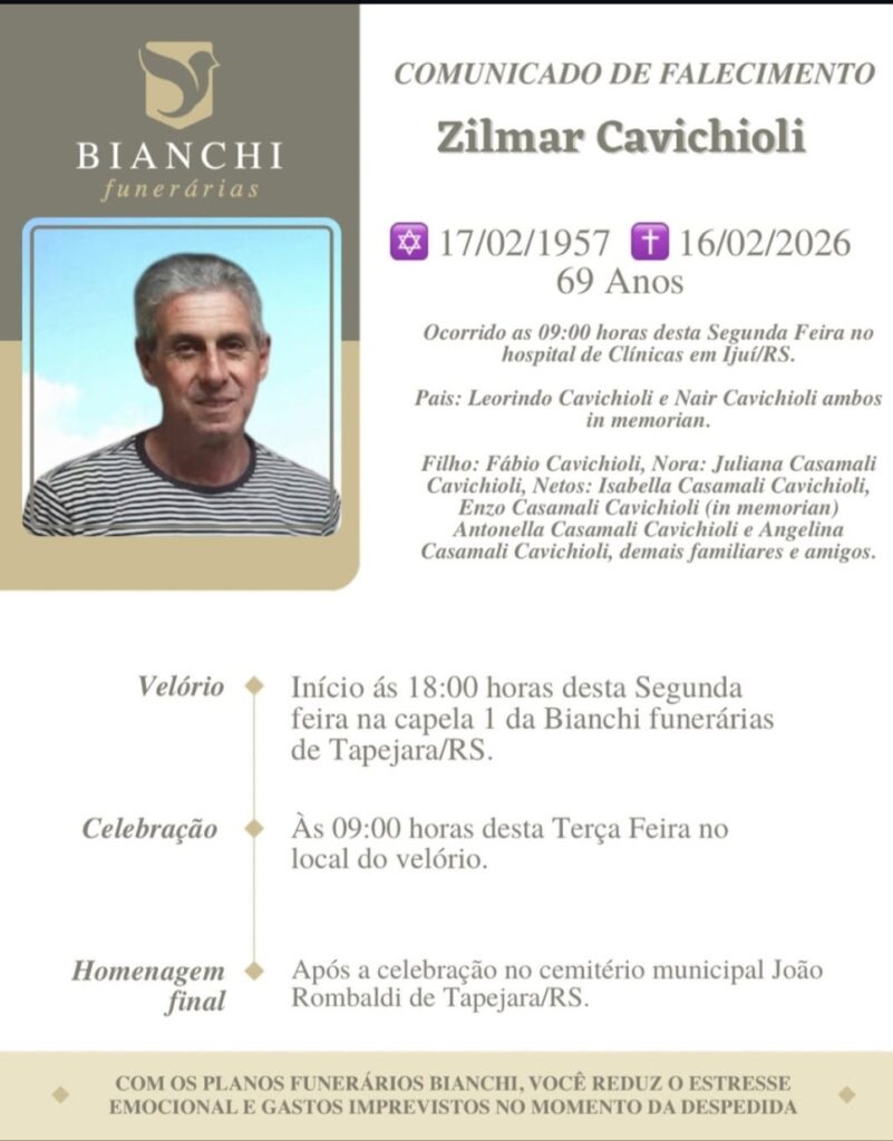 A Bianchi Funerárias juntamente com a família Cavichioli, comunica com pesar, o falecimento de Zilmar Cavichioli, ocorrido às 09horas do dia 16/02/2026 no Hospital de Clinicas em Ijuí com 69 anos de idade. Seu corpo está sendo velado na Capela 1 da Bianchi Funerárias. Celebração às 09horas do dia 17/02/2026 no local do velório e após seu sepultamento no Cemitério Municipal João Rombaldi de Tapejara RS.