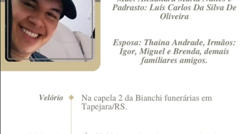 A Bianchi Funerárias juntamente com a família Nunes e Souza, comunica com pesar, o falecimento de Bryan Welligtom Nunes de Souza, ocorrido no dia 04/04/2026 com 20 anos de idade. Seu corpo está sendo velado na Capela 2 da Funerária Bianchi. Celebração às 08:00 horas do dia 04/04/2026 no local do velório e após seu sepultamento no Cemitério Municipal João Rombaldi.