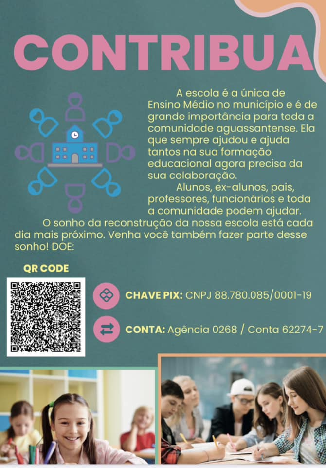Vamos todos contribuir com a educação dos nossos jovens reconstruindo a Escola de Ensino Médio de Água Santa e mostrar que quando a comunidade quer, se une e luta por um mesmo ideal tudo há de se concretizar. Certos da união do nosso povo, muito em breve, todos nós poderemos comemorar a reconstrução da nossa Escola Cláudio Antônio Benvegnú.