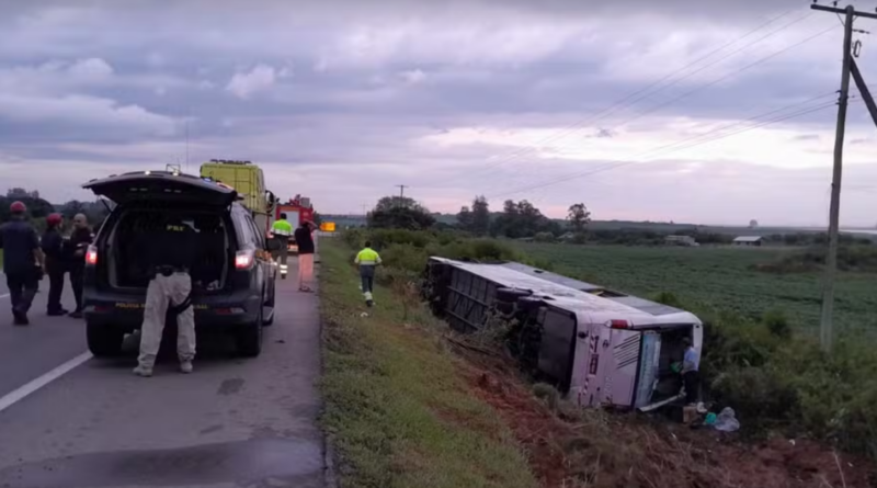 Ônibus sai da pista e tomba com 42 passageiros na BR-116, em Pelotas; PRF confirma 2 mortes e 40 feridos