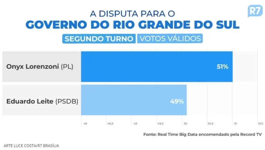 Se considerados apenas os votos válidos (descontados brancos e nulos), Onyx tem 51% e Leite tem 49%, portanto, também aparecem tecnicamente empatados dentro da margem de erro.
