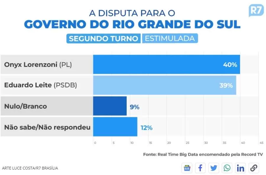 Os candidatos a governador do Rio Grande do Sul, Onyx Lorenzoni (PL) e Eduardo Leite (PSDB), estão tecnicamente empatados em intenções de votos no segundo turno da eleição. Na abordagem estimulada (em que os nomes dos candidatos são apresentados aos entrevistados), Onyx tem 40% e Leite tem 39%. Nulos e brancos são 9% e os que não sabem ou não responderam somam 12%.