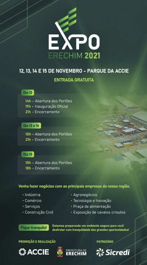 A feira vai acontecer entre os dias 12 a 15 de novembro, no Parque da Accie. A Prefeitura de Erechim repassou 400 mil reais para realização do evento, que terá entrada gratuita para o público.