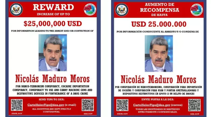 A Administração de Repressão às Drogas dos Estados Unidos fez uma publicação na rede social X oferecendo uma recompensa de até 25 milhões de dólares por informações que levem à prisão e/ou condenação do ditador da Venezuela, Nicolás Maduro.
