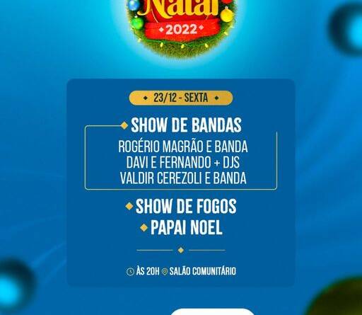 Dia 23 de dezembro, sexta-feira, com início às 20:00 horas, Show de Bandas no Salão Comunitário.