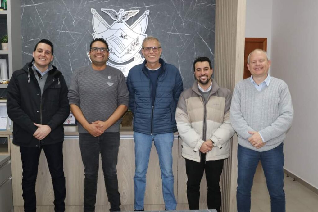 O prefeito municipal, Eduardo Picolotto, recebeu na manhã de hoje, 14 de julho, a visita do secretário estadual de desenvolvimento urbano e metropolitano, Carlos Rafael Mallmann, do assessor, Henrique Lagemann e dos chefes de gabinete, Guilherme Santos e Pietro Dalla.