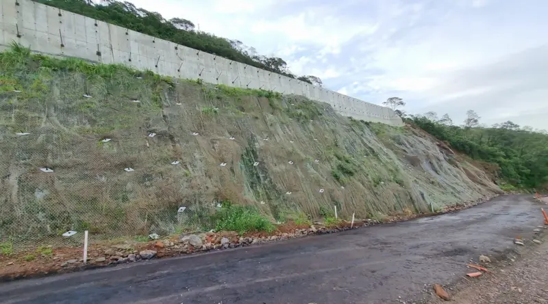 Neste trecho há três segmentos com medidas para evitar os escorregamentos, incluindo duas cortinas de concreto armado atirantadas e grampeamento do solo com tela metálica de alta resistência.