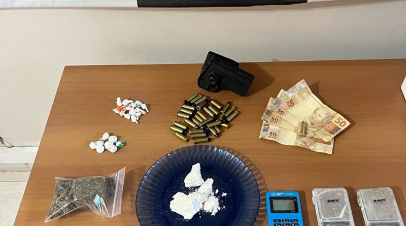 Durante o cumprimento de mandados de busca, expedidos pelo Poder Judiciário da Comarca após representação da autoridade policial, foram apreendidas uma porção de cocaína, uma porção de maconha e 22 buchas de cocaína prontas para comercialização. Além disso, os agentes recolheram 29 munições calibre .38, um coldre, duas balanças de precisão e telefones celulares.