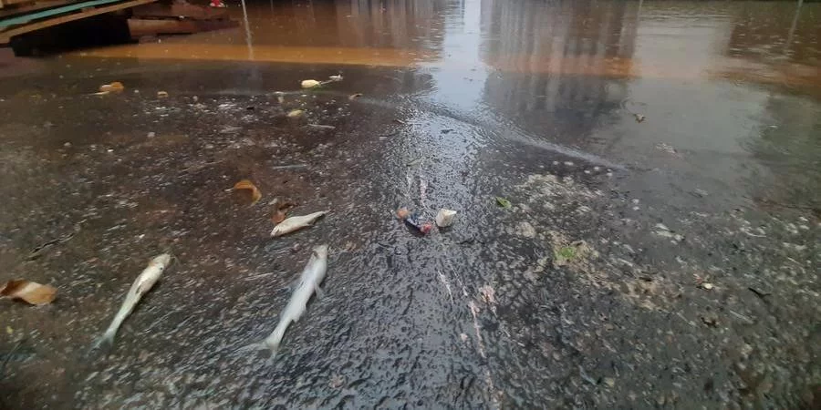 Após uma semana do início da enchente que tomou conta das ruas de Porto Alegre, a água começou a baixar no Centro Histórico nesta sexta-feira, deixando as marcas da inundação nas paredes dos prédios e das lojas. Esses pontos também acumulam lixo, sujeira e cheiro forte. Com o recuo da água, peixes mortos apareceram na esquina da Caldas Júnior com a Andradas e em outras partes do bairro.