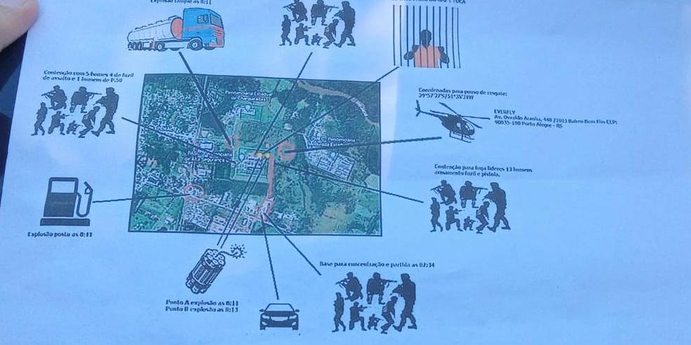 No plano considerado cinematográfico pelas autoridades, com mapas, desenhos e fotos, constava ataques com indivíduos fortemente armados, explosões de posto de combustível e caminhão tanque, rotas de fugas e emprego de um helicóptero. Dois coletes balísticos e munições de fuzil calibre 556 também foram apreendidos no interior do veículo.