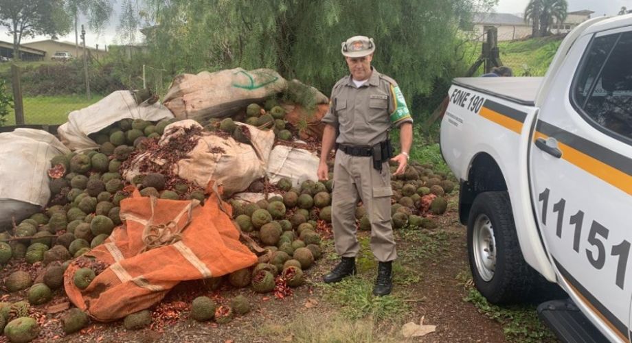 Em Lagoa Vermelha, os Policiais Militares destinaram duas toneladas de pinhão à Secretaria Municipal de Assistência Social, que fará a distribuição para o Lar de Idosos, Casas de Acolhimento e Escolas.